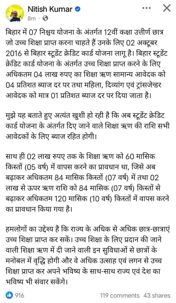 “बिहार में 07 निश्चय योजना के अंतर्गत 12वीं कक्षा उत्तीर्ण छात्र जो उच्च शिक्षा प्राप्त करना चाहते हैं उनके लिए 02 अक्तूबर 2016 से बिहार स्टूडेंट क्रेडिट कार्ड योजना लागू है। बिहार स्टूडेंट क्रेडिट कार्ड योजना के अंतर्गत उच्च शिक्षा प्राप्त करने के लिए अधितकम 4 लाख रुपए का शिक्षा ऋण सामान्य आएडक को 4 प्रतिशत ब्याज दर पर तथा महिला, दिवयांग एवं ट्रान्सजेंडर आवेदक को मात्र 1 प्रतिशत ब्याज दर पर दिया जाता है।”